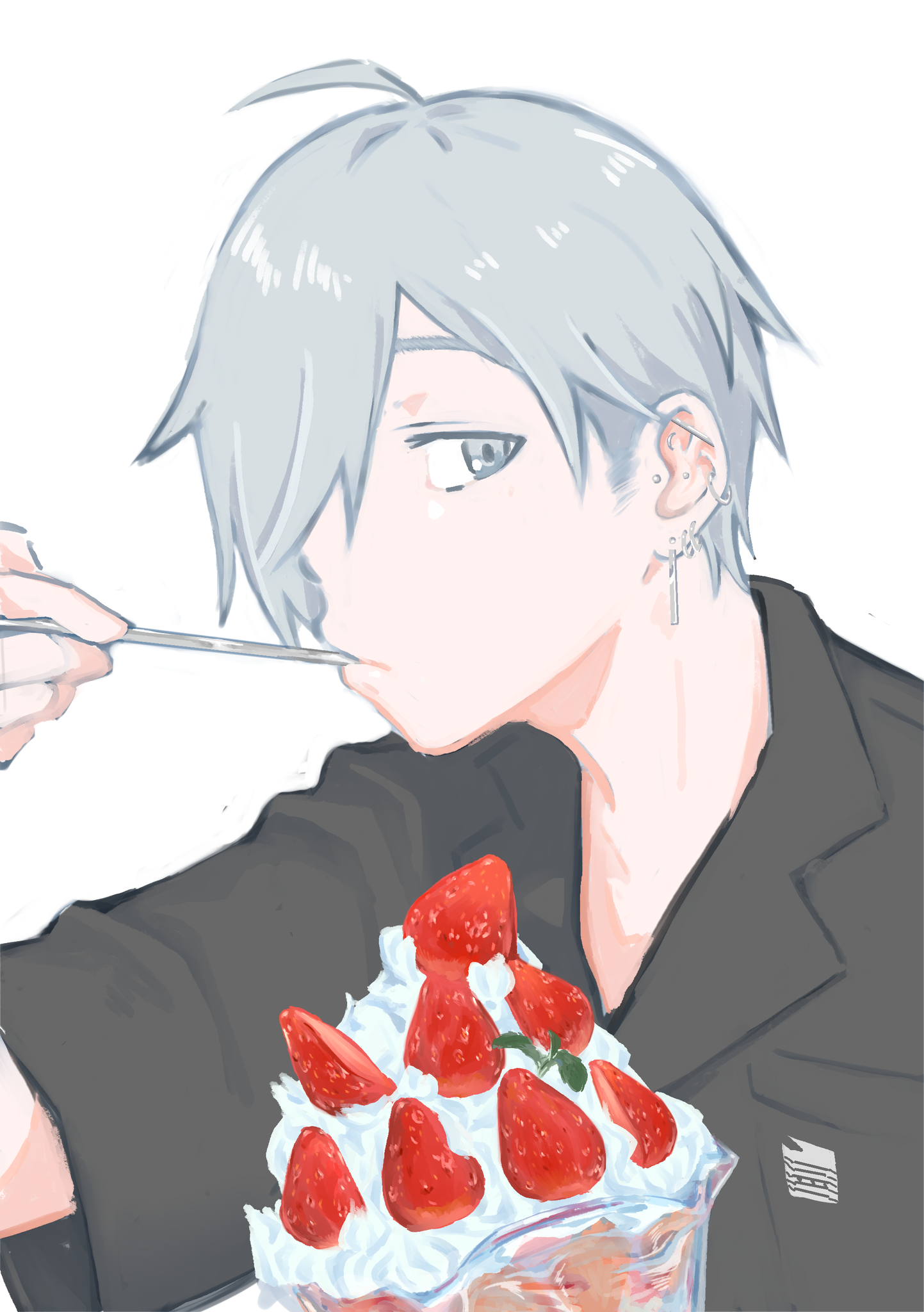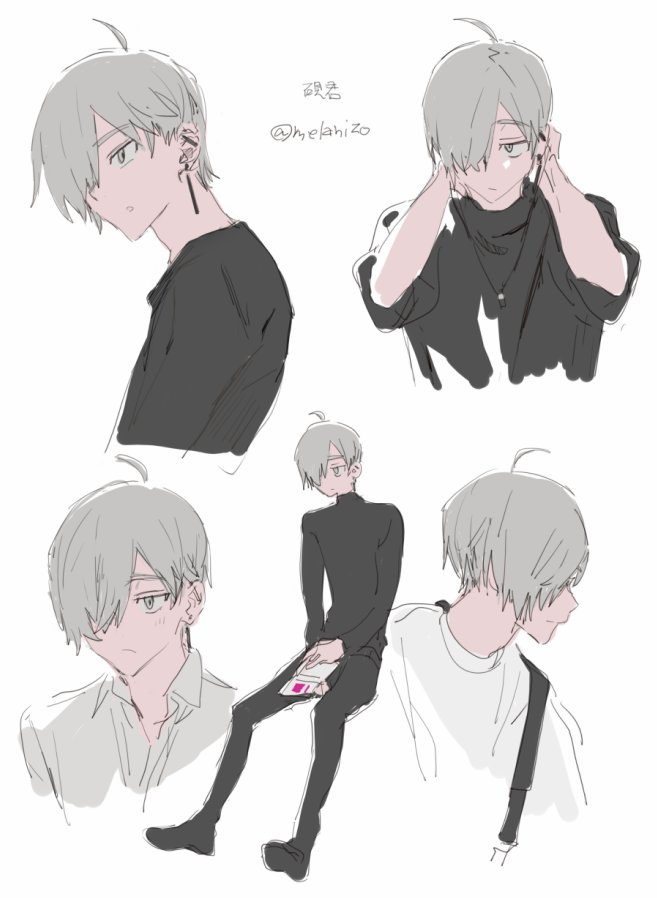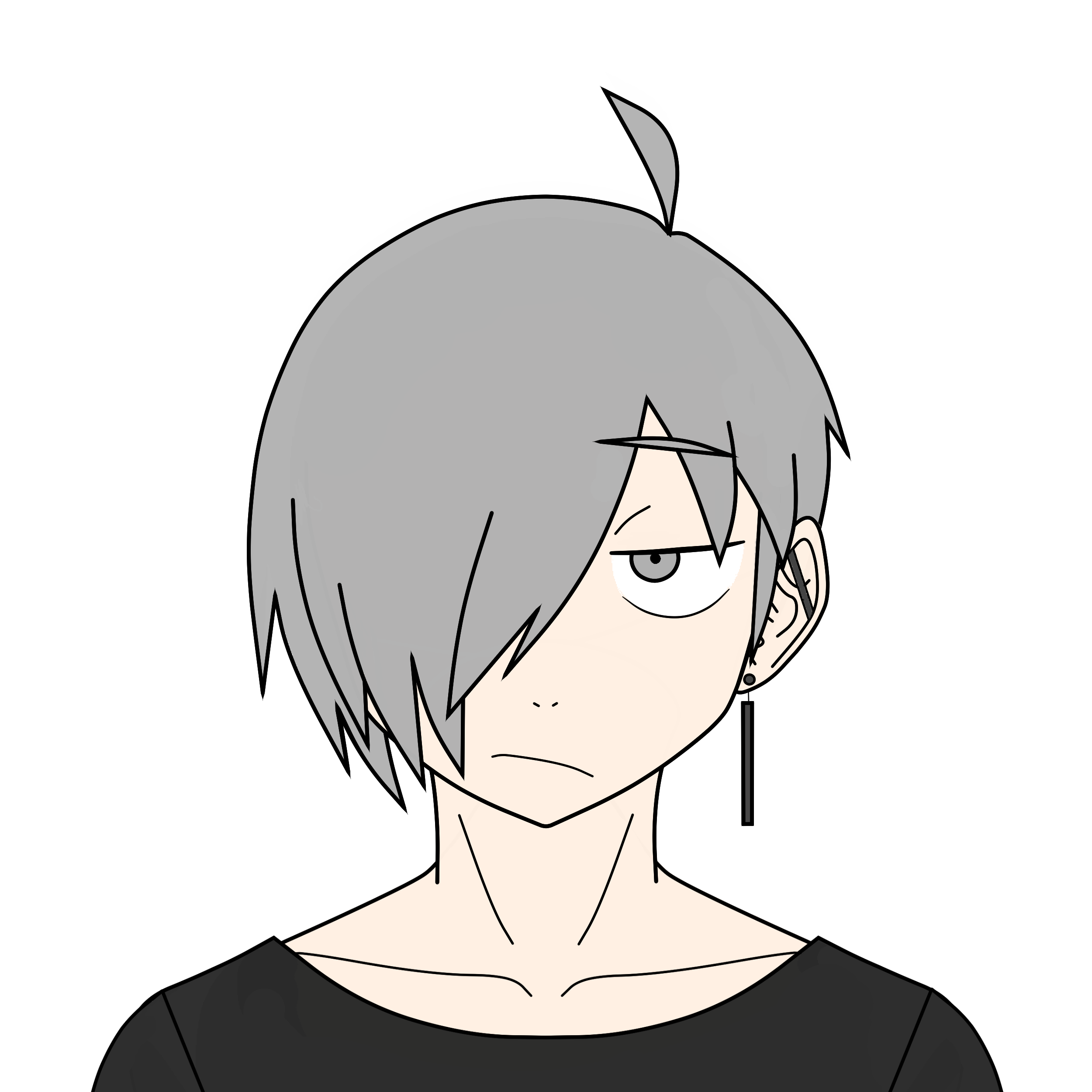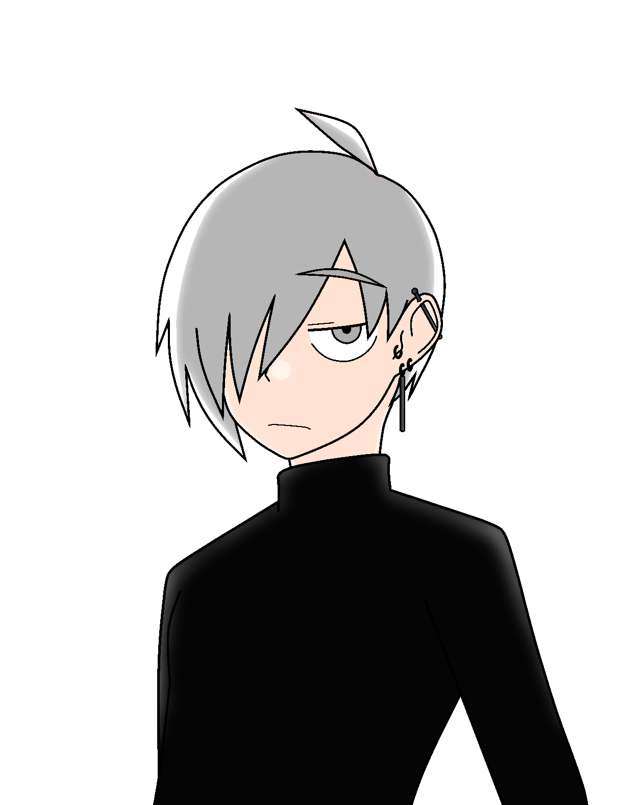 • 髮:銀灰色 (脱色) の直毛, 右目に掛かる